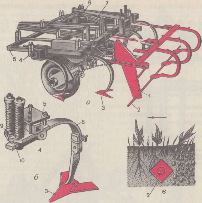 а — плоскорежущая лапа; б — схема рабочего процесса; в — общий вид; 1 — башмак; 2 — пятка; 3 — лемех; 4 — стойка; 5 — регулировочный винт; 6 — долото; 7 — лапы; 8 — колесо; 9 — винтовой механизм; 10 — рама; 11 — замок, автосцепки.