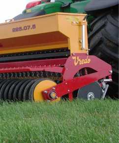 Принцип засева Vredo. Два V-образных диска делают узкий разрез в травяном покрове. Ходовое колесо обеспечивает приведение в действие кулачкового механизма диска и таким образом гарантирует необходимую дозировку. Семя направленно падает в V-образный диск и с его помощью опускается в разрез в земле на определенную настроенную глубину. Количество семян может быть непрерывно установлено с точностью до грамма. Скользящие подводки защищают травяной покров. Прижимной ролик закатывает разрез и раскатывает дерн. Семена оказываются хорошо защищенными в плодородной почве и получают оптимальное количество света, воздуха и тепла.